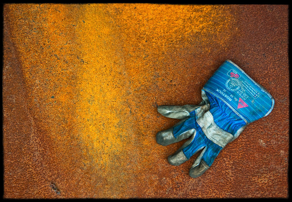 An beiden Orten findet man oft skurrile kleine Stilleben aus zurückgelassenen oder verlorenen Werkzeugen, Brettern oder Accessoires. Im vorliegenden Fall war es dieser Handschuh, der mein Interesse weckte. Toller blau/orange Komplementärkontrast, Feinkörniges und eher flächiges, Materialmix, der verstecke Witz mit dem Wortteil „Rost“ auf dem Handschuh… da passiert ganz viel.
